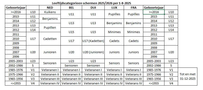 Er zijn verschillende leeftijdscategorieën in schermen. Dit zijn de categorieën voor het schermjaar 2024-2025: